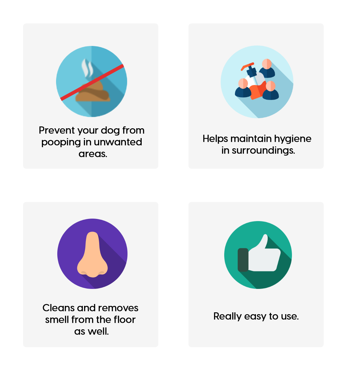 This spray generates an odor that dogs hate! As a result, when you use this spray in the area where dogs usually pee or poop, they prefer not to go there anymore as they can smell the spray. Repeated use trains them to not to pee or poop in the area where the spray is regularly used.